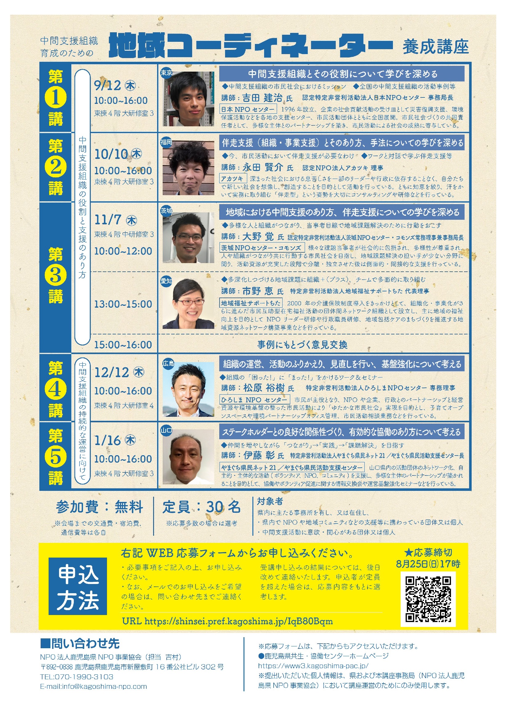 令和6年9月から翌7年1月にかけてカクイックス交流センター(かごしま県民交流センター)で、全5回に分けて開催された中間支援組織育成のための講座に参加した。